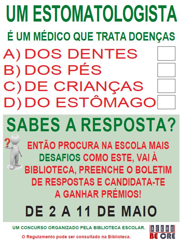 Aqui deixamos alguns dos cartazes, algumas das perguntas que foram espalhadas por diversos locais da escola, e os boletins para as respostas.